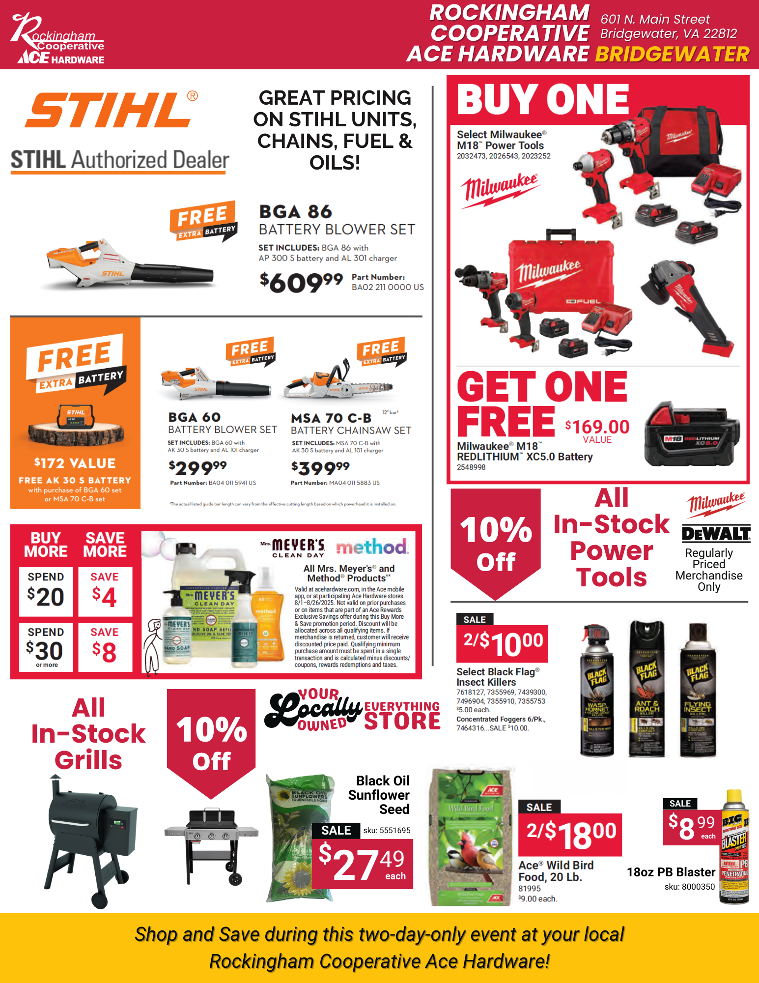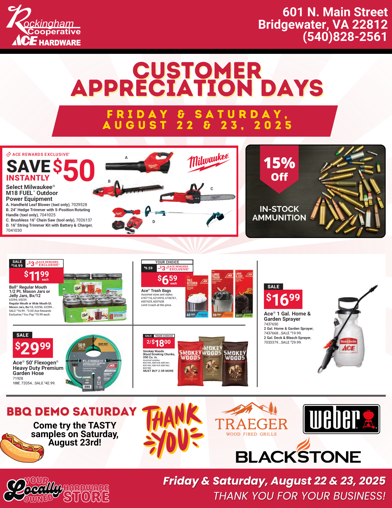 Join us at Rockingham Cooperative Ace Hardware in Bridgewater on Friday & Saturday, August 22nd & 23rd for Customer Appreciation Days, featuring: